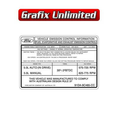 EB ED 5Litre Emission Decal. Suits all models 1991 - 1995. Part Number 91DA-9C485-CC.