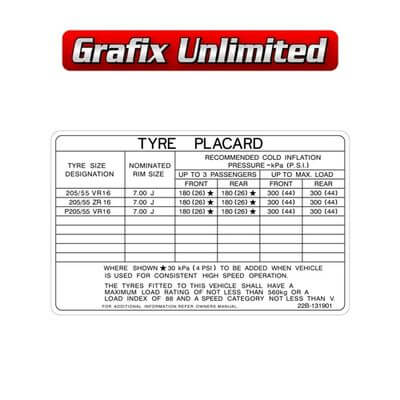 Tyre Placard Part Number 22B-131901. Suits VN Clubsport.